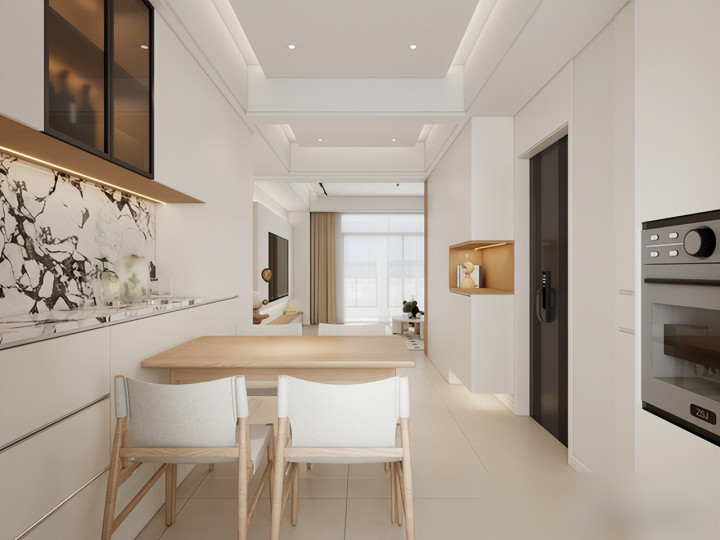 就说那客餐厅一体柜吧,暖白柜体配原木色点缀,看着清爽又敞亮,小户型立马显大不少。
